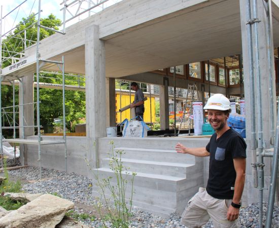 Das Gemeinschaftshaus soll nach der Fertigstellung im September 2018 für Events genutzt werden. Im Moment ist die spätere Unterteilung der Räume noch nicht zu erkennen, da sich das Gebäude noch im Rohbau befindet. Martin Grossmann zeigt deshalb, wo sich Loggia (offener gedeckter Sitzplatz), Küche, WC und der grosszügige Gemeinschaftsraum später befinden werden. Er ergänzt: „Grosse Fensterflächen werden für lichtdurchflutete Räume sorgen.“