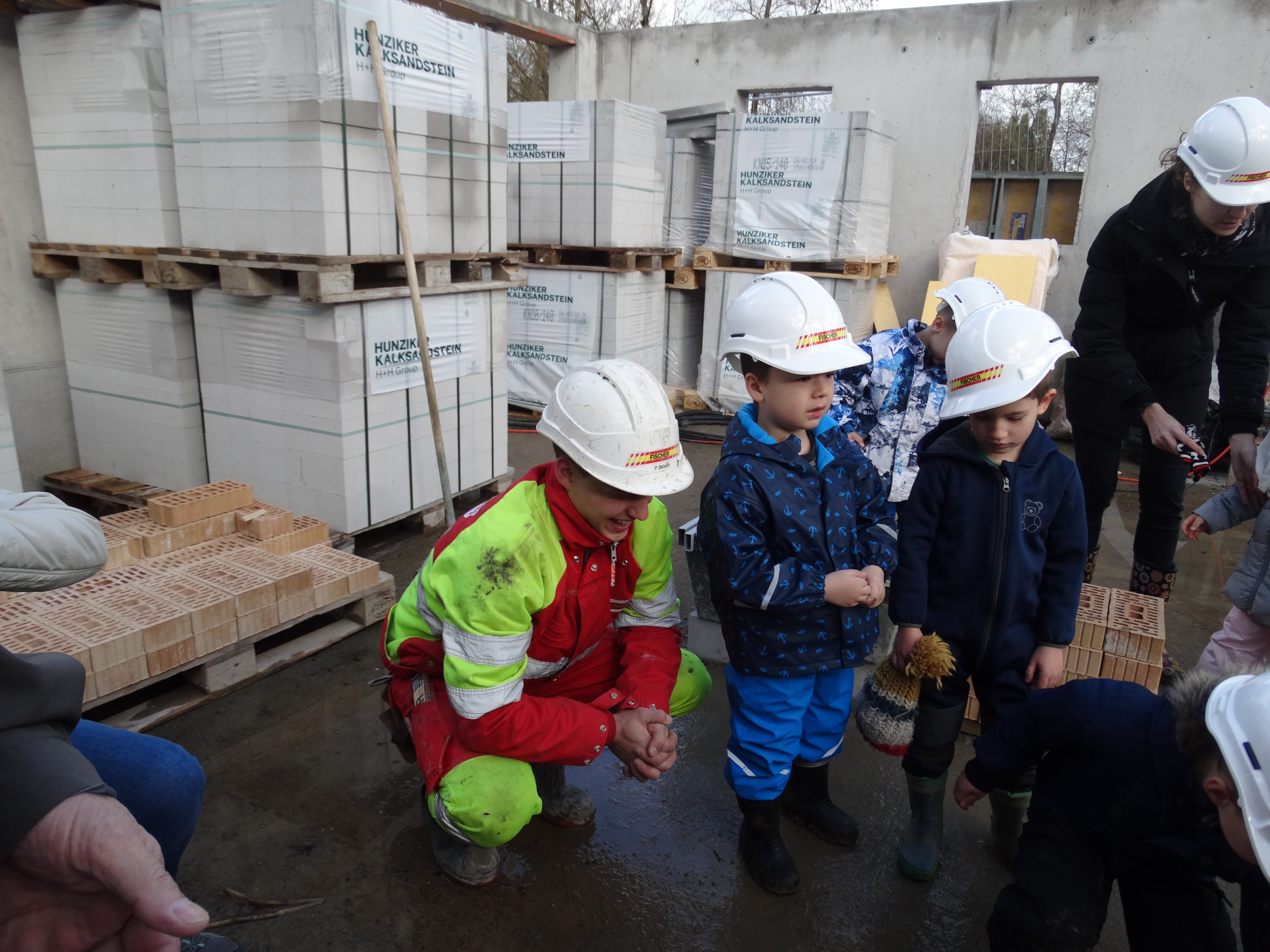 Der neue Kindergarten befindet sich direkt neben dem bestehenden KiGa. Die Kindergartenkinder konnten jeden Tag auf die Baustelle blicken und sahen, wie die Arbeiten voranschritten. Ganz typisch für Kinder in dem Alter wurden dabei auch Fragen gestellt und der Kran bewundert. Aus diesem Grund kam Christoph Hitz, dem zuständigen Bauführer, die Idee für ein ganz besonderes Projekt: Ein Kindergartenbesuch auf der Baustelle!