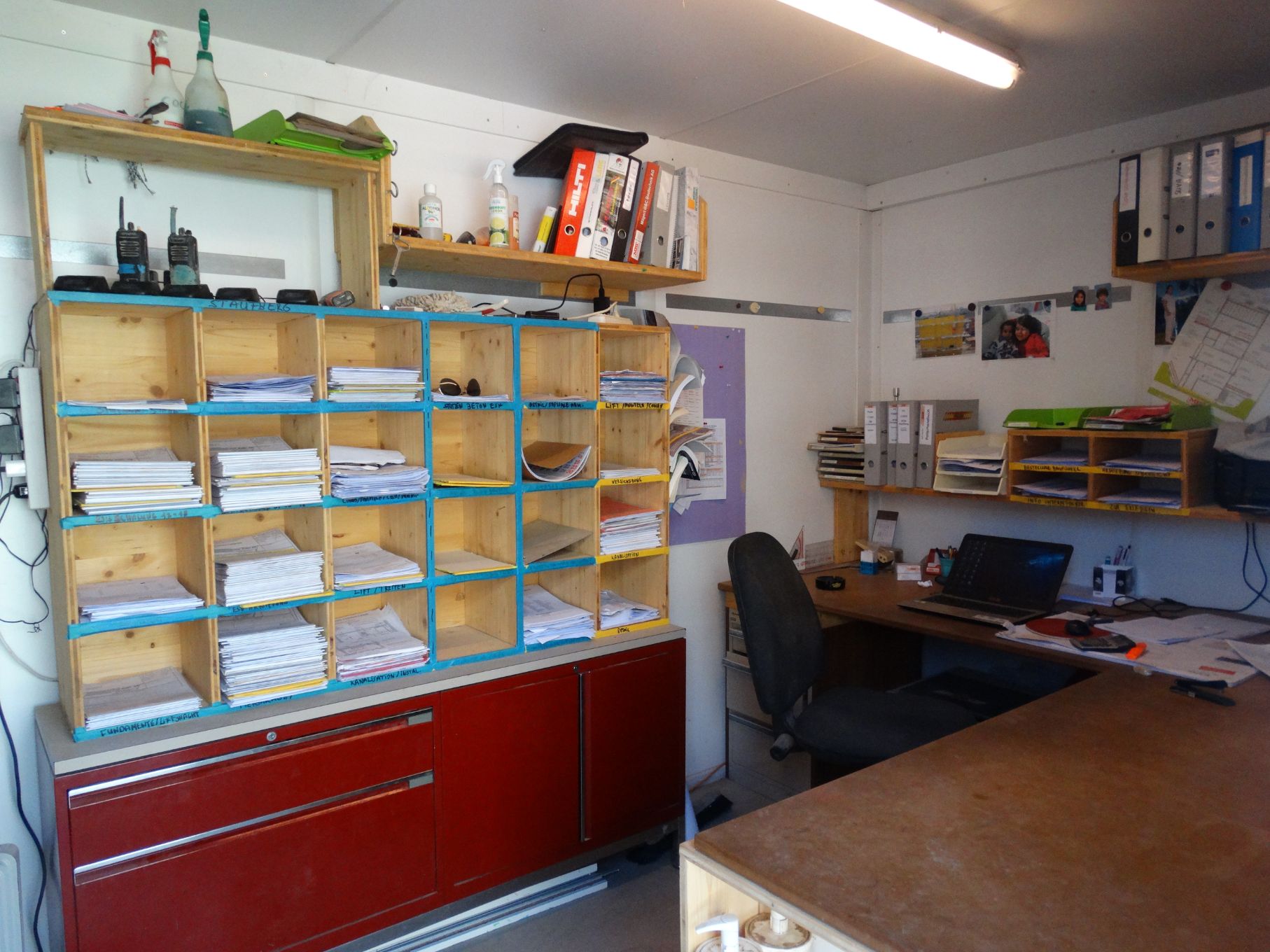 Bildlegende: Hayri Keskin zeigt seine Baracke | Arbeitsplatz in einem Poliercontainer der MFAG | Nur ein Teil der Pläne der Grossbaustelle.